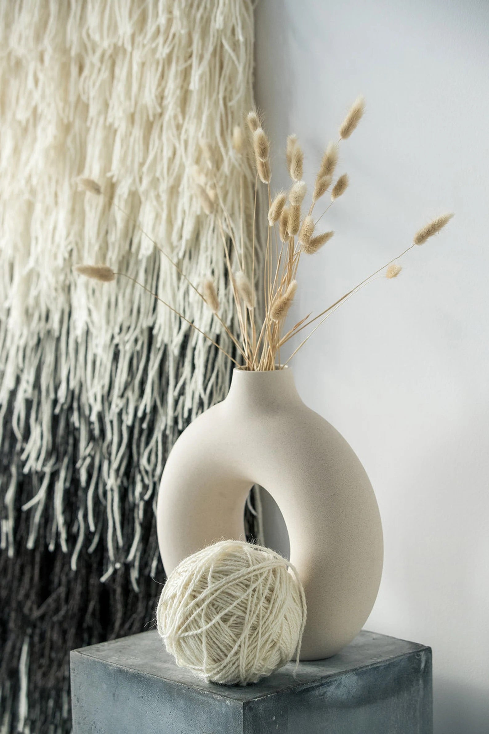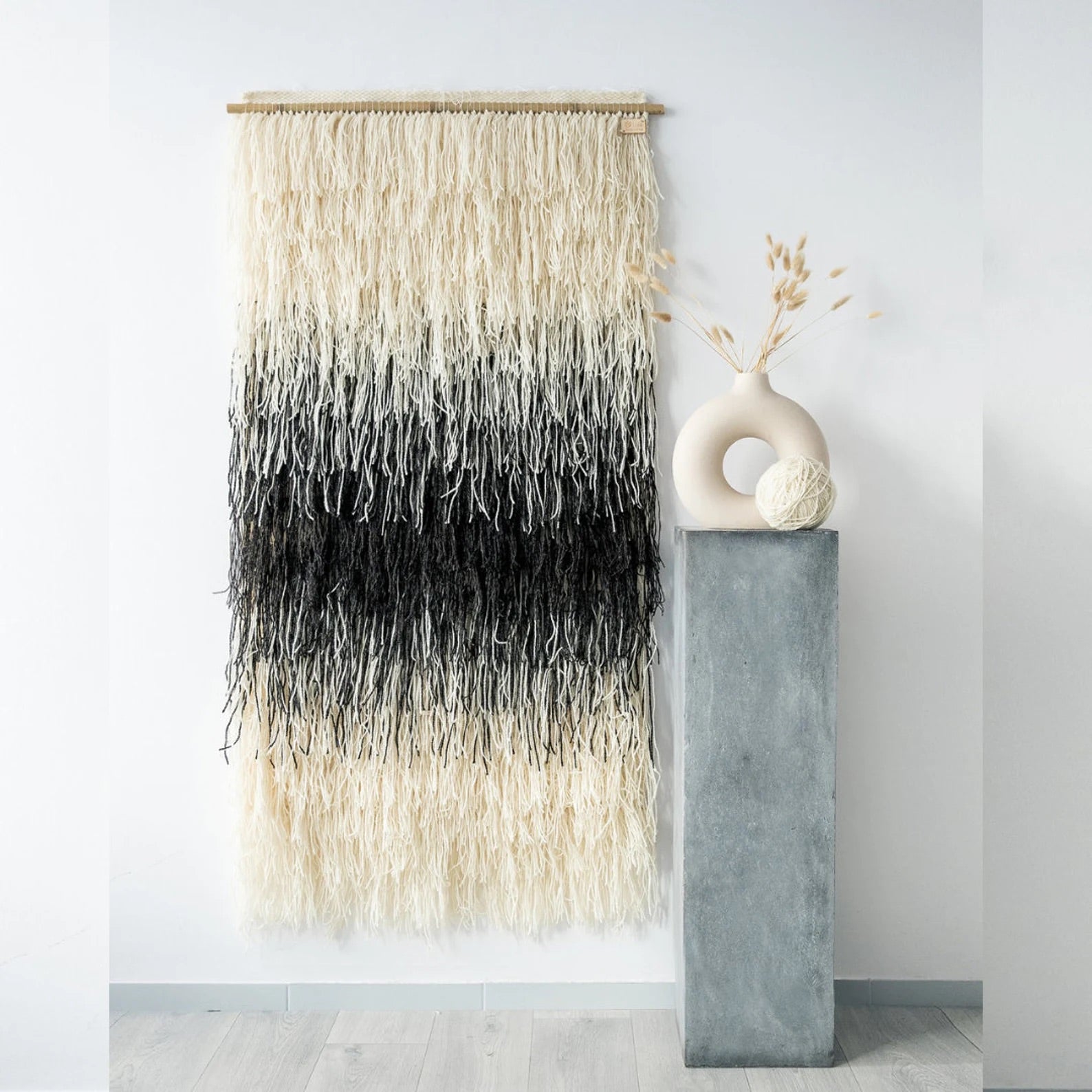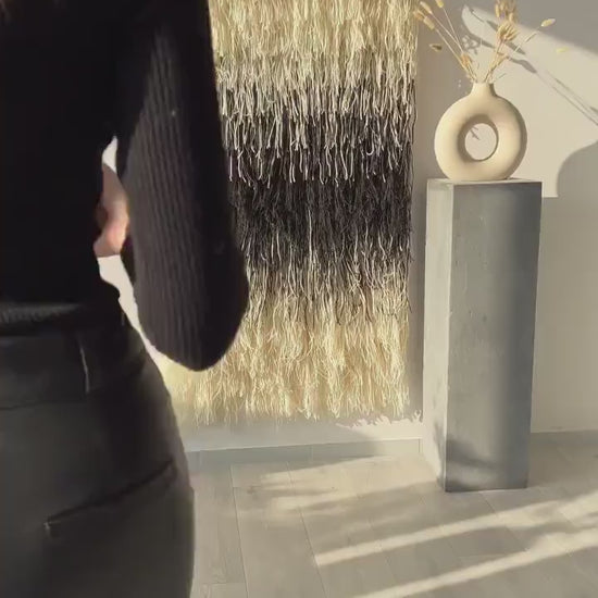 Transform your space with Gerhana, a stunning wall tapestry from the Shaggy collection. Featuring natural wool in black, beige, and off-white tones, this handwoven art piece offers a bold yet sophisticated touch. The long, textured strands create a dynamic, layered effect that captures the essence of modern elegance and tactile beauty.