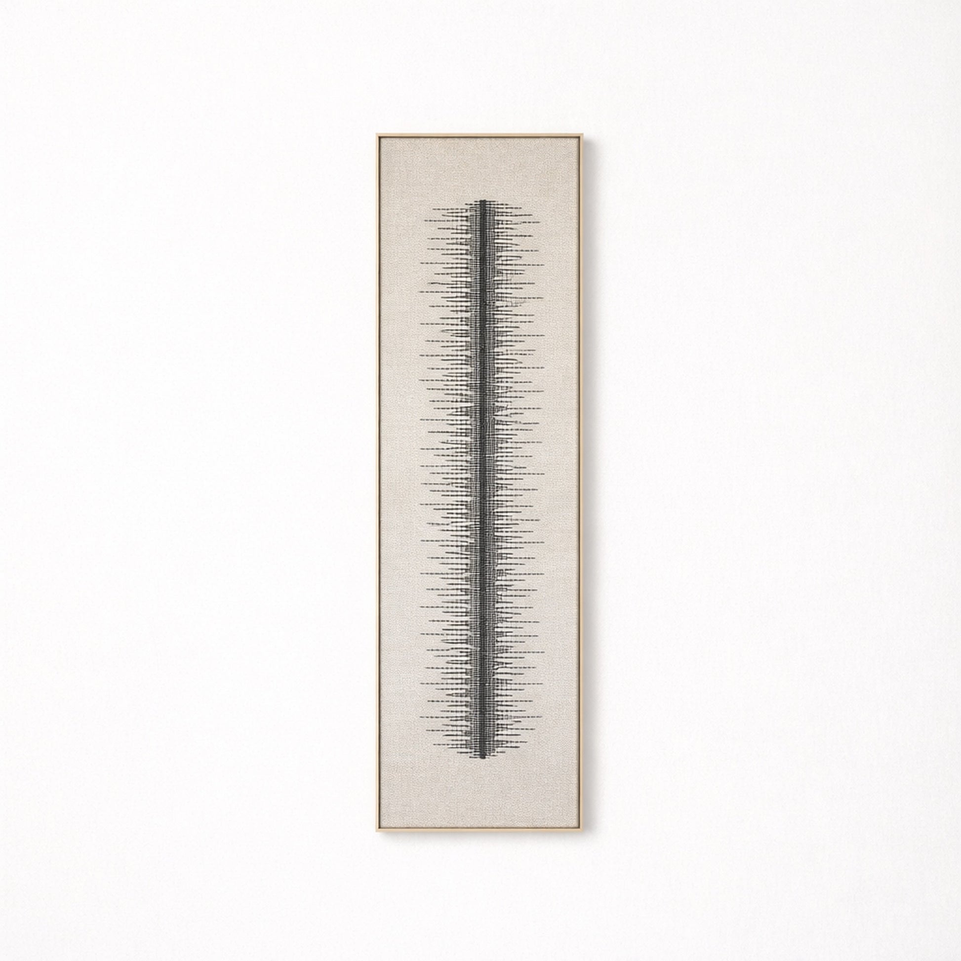The sound wave pattern runs from top to bottom, creating a continuous visual rhythm. Subtle shifts in the grey tones introduce depth and dimension, while the neutral palette keeps the piece timeless and easy to integrate with existing decor.