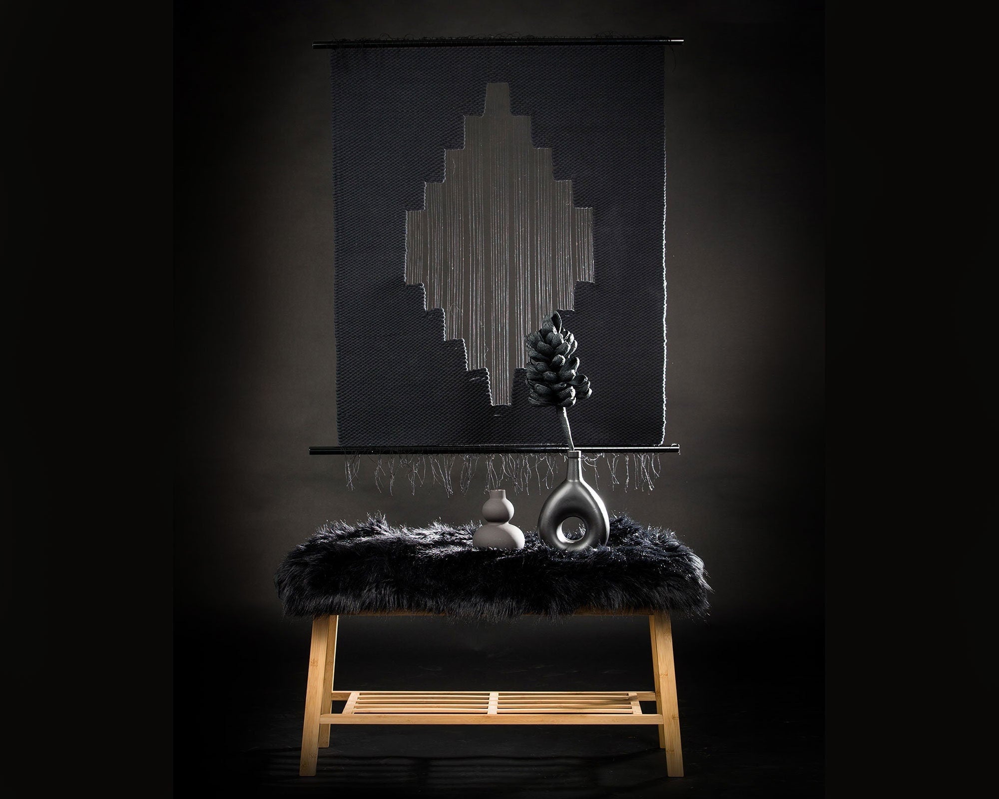 Discover the dramatic beauty of the Lohe wall tapestry, a handwoven masterpiece that combines bold textures with minimalist design. Suspended on a sleek metal rod, this tapestry features intricate, three-dimensional woven stair patterns that add depth and sophistication to your home decor. Crafted with care, it’s the perfect statement piece for modern or industrial interiors.