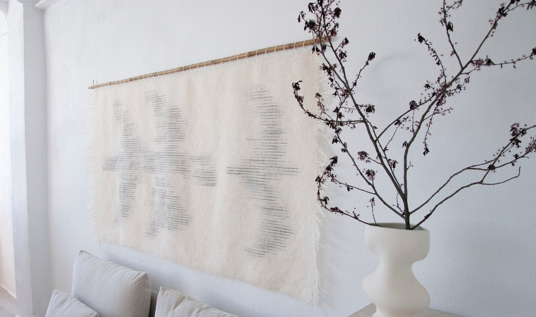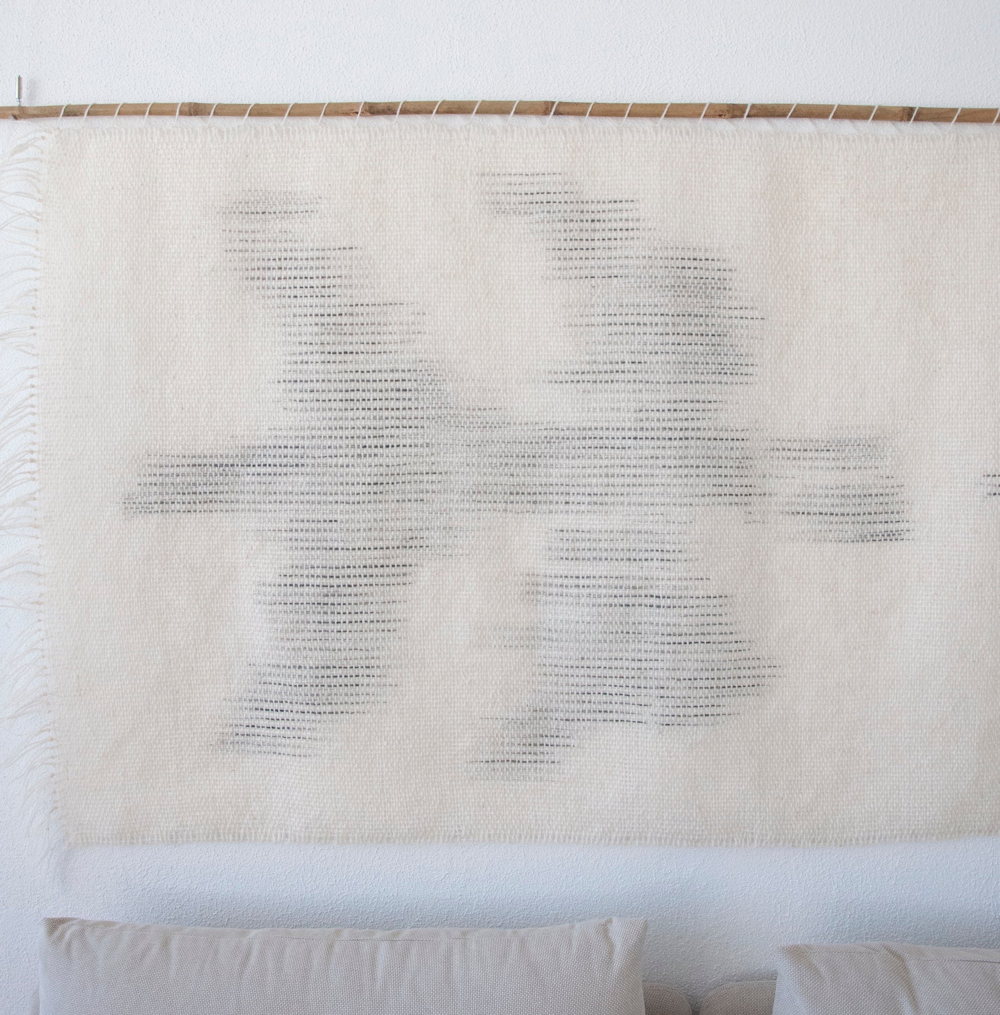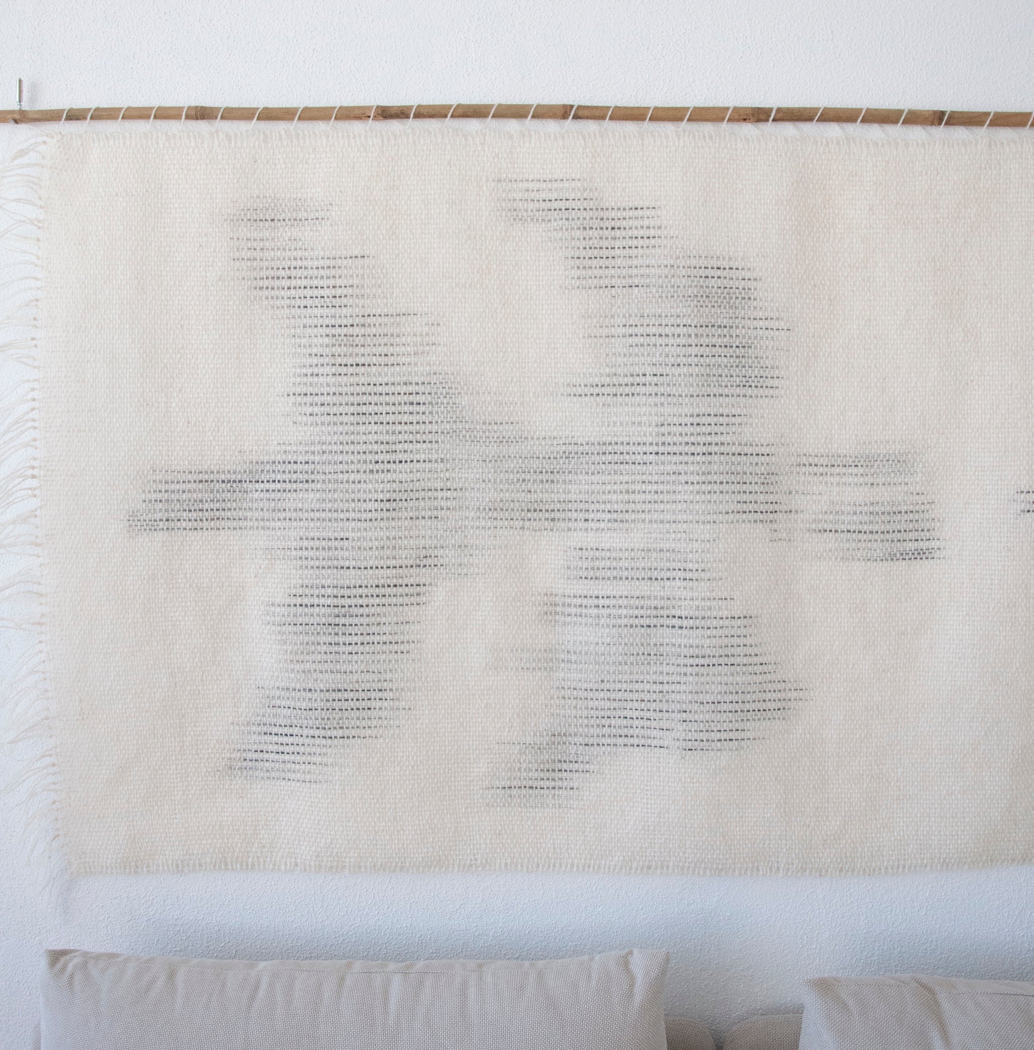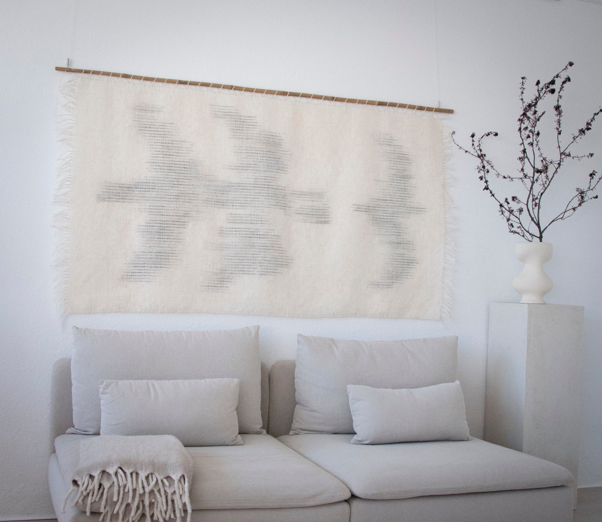 Discover the poetic sophistication of Zeva, a handwoven wall tapestry inspired by the fleeting silhouettes of birds in flight. This exceptional piece brings together natural wool in a delicate harmony of soft cream and subtle grey accents. Its ethereal composition transforms any modern or minimalist interior into a sanctuary of serenity and contemporary art.